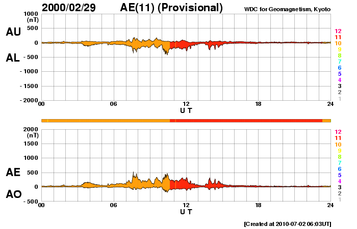 指数を算出するのに用いた観測所の数は色で表してあります。色と観測所数の対応はプロットの右側に示されています。 この指数を使う時は、たった一つの観測所のデータが抜けているだけで、大きな地磁気擾乱でさえも見逃してしまう可能性がある事に注意してください。 また、生データをチェック無しに用いているため、ノイズやベースラインの変動が含まれている可能性がある事にも注意してください。 AE観測所および京都WDCはこれらに関しては責任を負う事はできません。