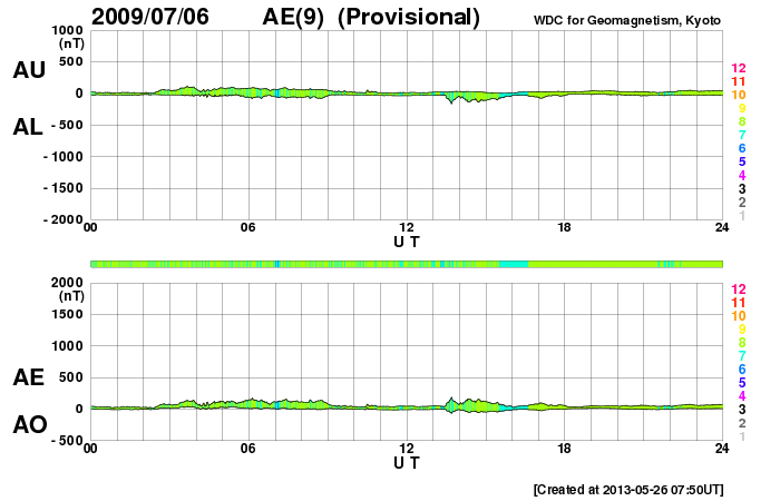 The number of stations used to derive the index is shown in color. The color scale is displayed at the right of the plot. Users should note that a loss of only one station could miss significant disturbance events.