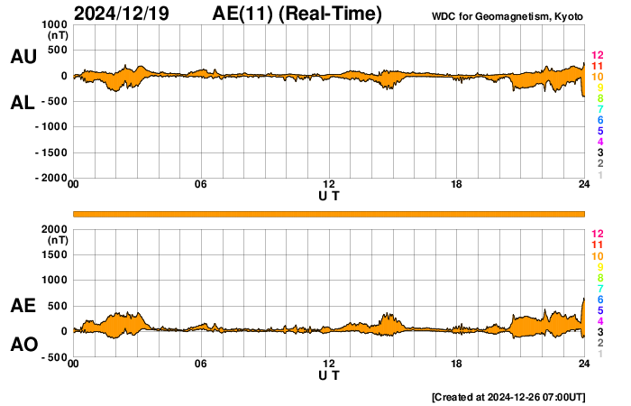 We thank AE stations (Abisko [SGU, Sweden], Dixon Island, Cape Chelyuskin, Tixie Bay, Pebek, Amderma [AARI, Russia], Barrow, College [USGS, USA], Yellowknife, Fort Churchill, Sanikiluaq (Poste-de-la-Baleine) [GSC, Canada], Narsarsuaq [DTU Space, Denmark], and Leirvogur [U. Iceland, Iceland]) as well as the RapidMAG team (NiCT, JHU/APL, UoA, AARI, IDG) for their cooperations and efforts to operate these stations and to supply data with us for the real-time AE index.